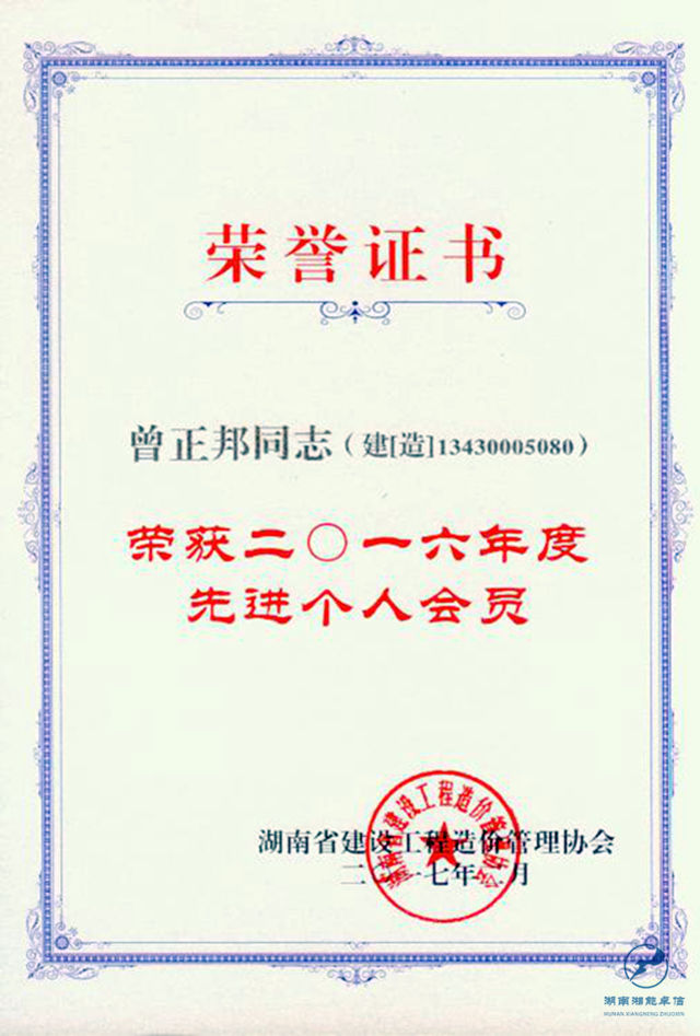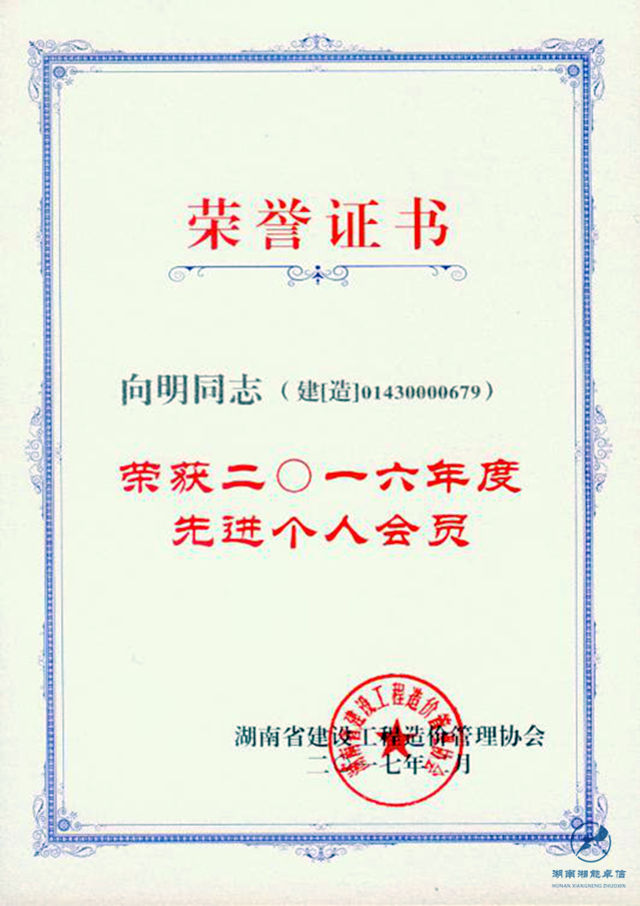 2017年2月湖南省建設工程造價管理協會組織開展了2016年度先進單位會員、先進個人會員、先進單位、協會先進工作者評選活動,我司獲得“2016年度先進單位會員”稱號,向明、朱虛新、曾正邦獲得“先進個人會員”稱號。