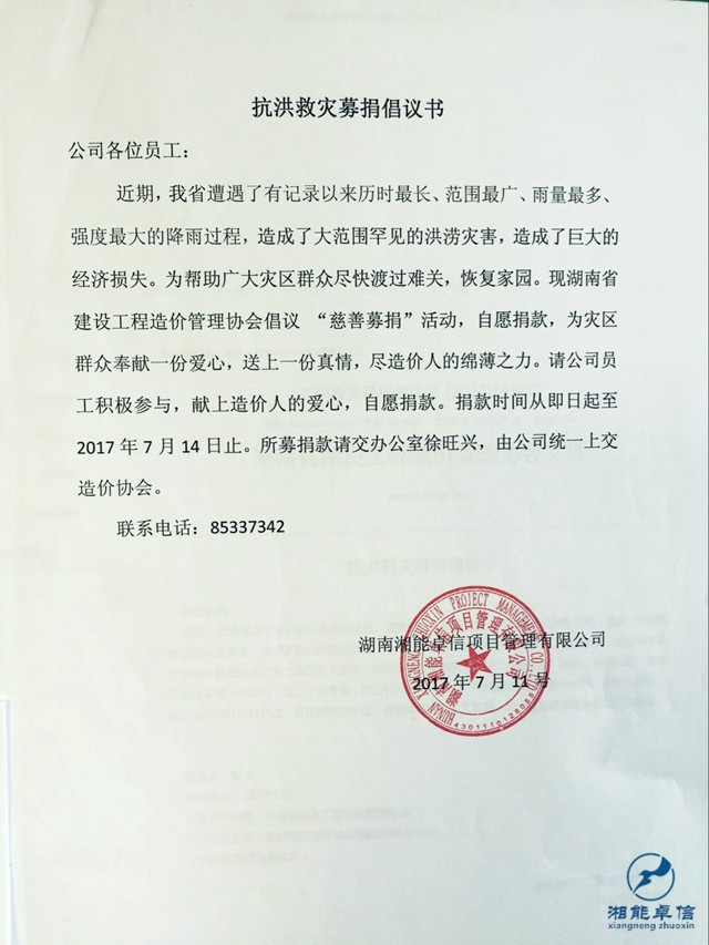 2017年7月10日湖南省建設(shè)工程造價(jià)管理協(xié)會(huì)組織開展抗洪救災(zāi)“慈善募捐”活動(dòng)。我單位積極響應(yīng)發(fā)出倡議,募得捐款共:5470元,已如數(shù)上交湖南省工程造價(jià)管理協(xié)會(huì)。